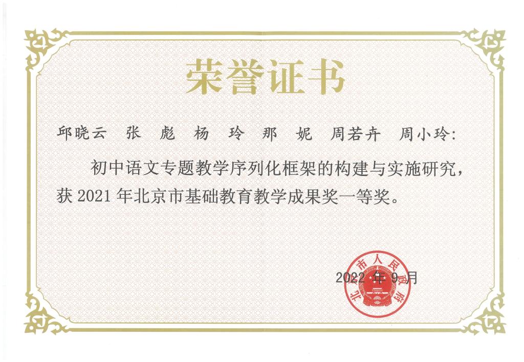 因疫情原因,2022年北京市基础教育教学成果奖颁奖工作近日开展。经过专家严格评审,bg真人娱乐邱晓云老师团队的《初中语文专题教学序列化框架的构建与实施研究》荣获一等奖。