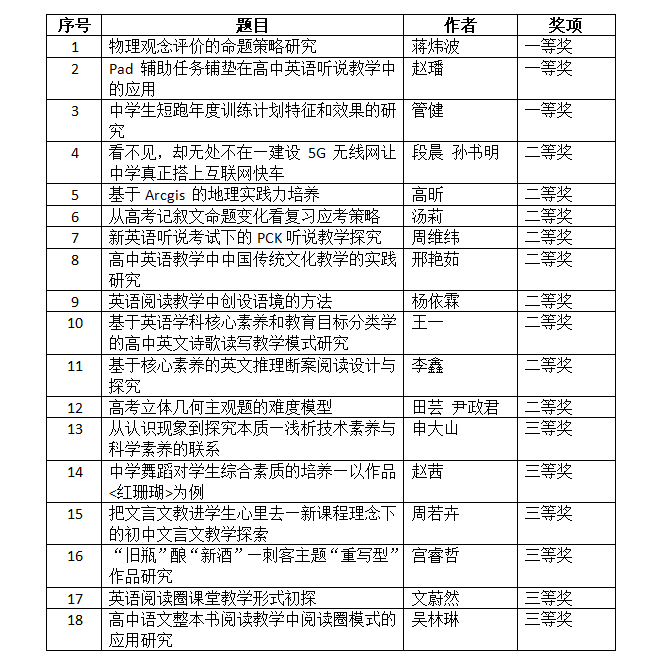 2019年9月10日,海淀区第十六届教育科研优秀论文评选结果揭晓,bg真人试玩共有18篇教师论文获奖,其中,3篇获一等奖,9篇获二等奖,6篇获三等奖。