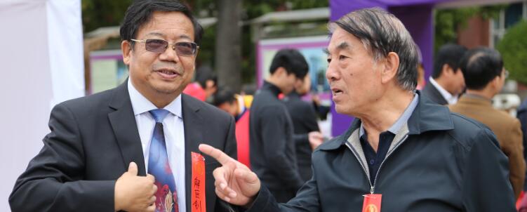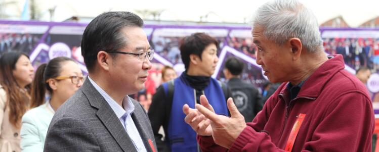 王殿军校长(左)与老校友交流学校发展情况