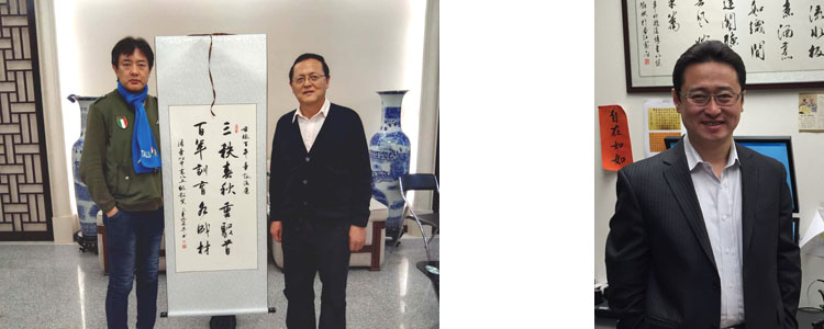 左图:王英民老师(右)与高857班召集人王晨曦;右图:字画作者、高857班校友邓斌