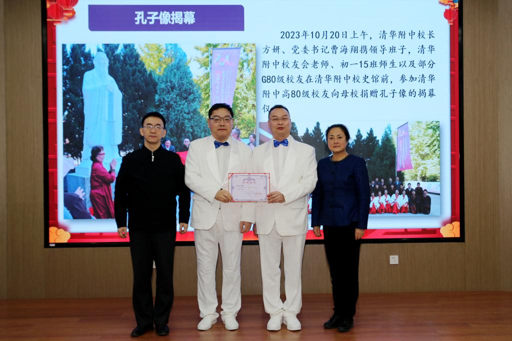 高80级校友向母校捐赠“孔子像”,为学校立德树人,教书育人增添了一个重要的教育景观。方妍校长和曹海翔书记代表母校向高80级校友颁授了捐赠证书。