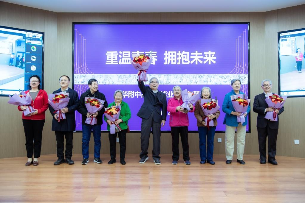 活动中,校友们集体向校领导和曾经授课的老教师们献花,老教师们脸上洋溢着温暖而自豪的喜悦。随后,张能光老师和王英民老师作为教师代表上台讲话。