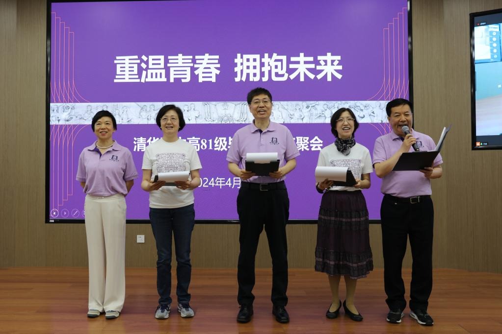 王英民老师朗诵《8号风球下》,在诗中他以伴随学生成长、见证生命奇迹、分享成长快乐,作为他坚持在附中近50年的原因,回忆四十年前共同度过的青春岁月。他向校友们表示衷心感谢,为他们在各自领域取得的辉煌成就感到无比骄傲。他以自己创作的《美丽的珊瑚》为结尾,寄语校友们像珊瑚一样经过海浪的洗礼依旧坚忍不拔、熠熠生辉,把生命的美丽和奇迹献给附中、献给清华。