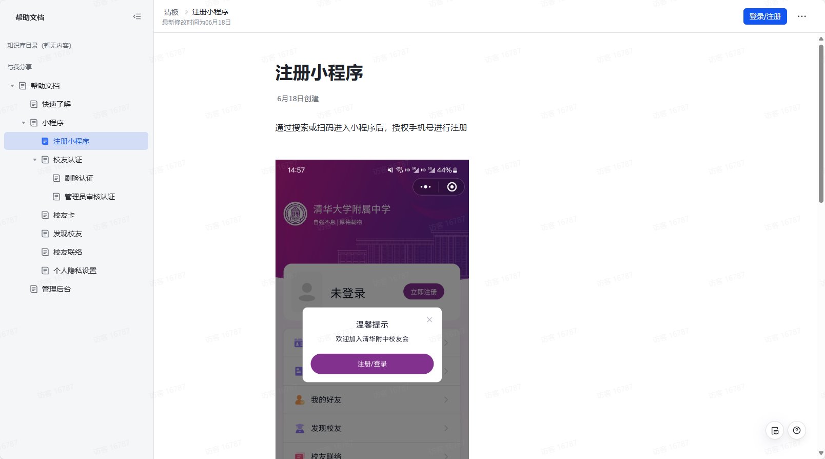 注册使用:当您的年级开始开放注册时,请按照通知中的指引,通过校友总会公众号下方给出的小程序链接,扫码进行注册。注册成功后,您就可以开始使用小程序各项功能了。注册助手:为了方便大家快速注册并使用小程序,您可以提前通过查看“注册助手”了解小程序注册流程。请点击下方链接查看注册助手:https://tsinghub.feishu.cn/wiki/VCgNwaAUBi9k4bkC8sjcQ9x3nLe?from=from_copylink(复制并打开链接)