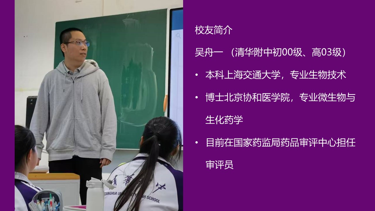 10月24日下午,吴舟一校友走进了bg真人娱乐的课堂,与高2405班的同学们共同探索生物制药的奥秘。他从一些国际上知名的生物制药案例入手,结合时事发展,用风趣幽默的语言,将同学们一步步带入这个内涵丰富的学科领域,激发了同学们对生物制药的浓厚兴趣。