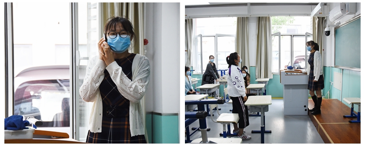 之后,进行学生课上身体不适的模拟演练。学生举手示意身体不适。授课教师报告疫情处置组王潇琳老师和班主任老师,班主任通知学生家长。班主任或任课教师组织学生前往备课隔离室,做心理疏导和情绪安抚。其他学生出教室时,避开患病学生的行走路线。