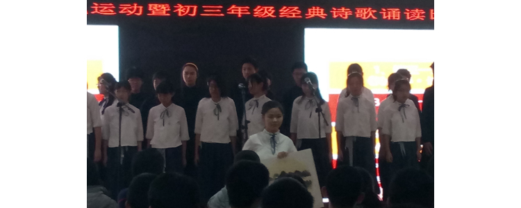 接着是初三(4)班,他们朗诵了两首取材于《红岩》的革命诗《我的自白书》和《囚歌》。他们用慷慨激昂的声音表现出了许云峰、陈然、叶挺等志士的坚贞与不屈。他们坚信中华少年是祖国未来的光明。