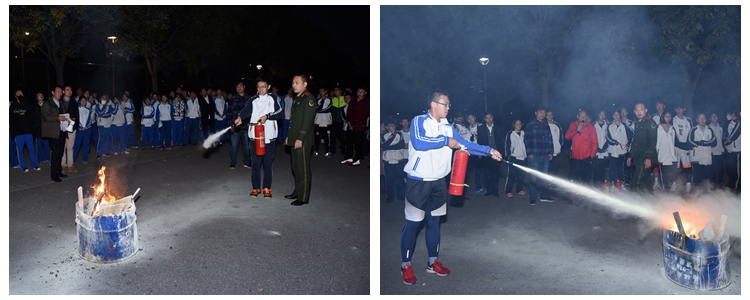 紧接着消防演习在校区东门停车场展开。曹亮警官现场教学,手把手教学生用干粉灭火器灭火,并从各班中挑选出代表演示灭火操作。而后曹亮警官让学生参观消防车,并介绍消防车各部分的组成结构和作用。最后消防员们现场演示了佩戴消防装备的过程,并现场演示接水管和喷射高压水等操作。
