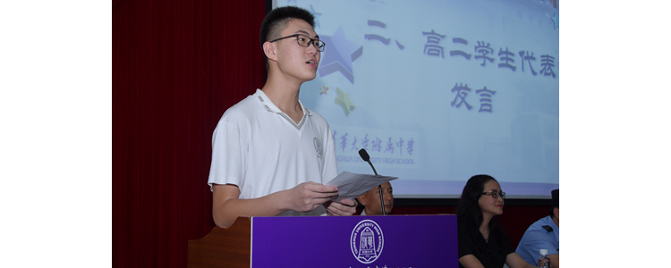 在庄严的国歌声中,大会正式拉开序幕。高二(3)班滕伟代表学生发言。他回顾了高二同学这一年来的学习、校园生活。为新高一的学弟学妹们加油打气。他希望并坚信所有高二同学都能成为学校的带头榜样,更具有活力与朝气。