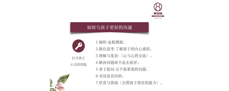 随后,潘老师以自己的育儿经验为例,提出与孩子沟通的3点建议3个注意7个方法。她建议家长与孩子要有心的交流、打开孩子的心灵以及给孩子全人教育。家长要注意的是孩子需要尊重、信任以及无条件的爱。