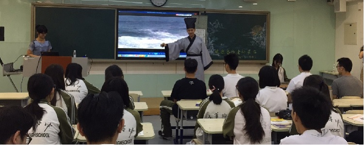 英语赵璠老师以学生朗诵英文版“桃花源记”开场,引主题“Utopia”(托马斯•莫尔著)。赵璠老师将作者简介与新词学习巧妙结合,让学生在短时间内了解中外先贤对理想国的描述。