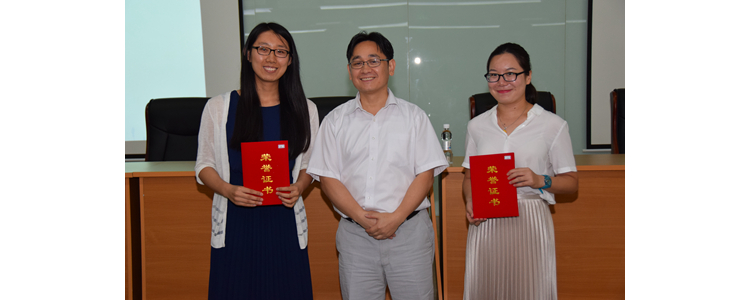 朱建宏校长(左3)、张姝敏副校长(右3)、程惠云副校长(右1)为优秀班主任颁奖