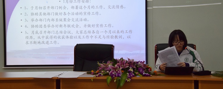 首先,王泉燕对新加入团委这个大家庭的同学们表示欢迎,并简单介绍了出席此次大会的各位老师、各个部长及召开此次大会的目的。随后,各部门部长对本部门本学期的工作目标和工作计划进行了具体的阐述。王一琳老师在每个部门阐述完毕后进行了简单的点评和指导。王一琳老师的认真严谨和每个部长的幽默镇定让同学们对自己部门的工作内容有了一定的了解,同时也消除了同学们心中的紧张感,让彼此之间变得更加亲切。校园电视台指导老师赵婉婷补充了校园电视台今后的工作计划,并用自己高中时期的例子告诉同学校园电视台的主要任务。最后,王一琳老师和王泉燕对本次大会进行总结,对全体团委成员给予厚望。
