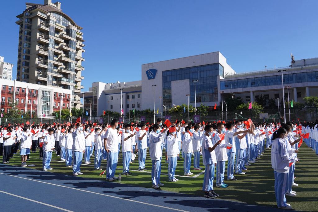 典礼伊始,庄严的国歌由校管乐团奏响,五星红旗冉冉升起,全体师生奏唱国歌。