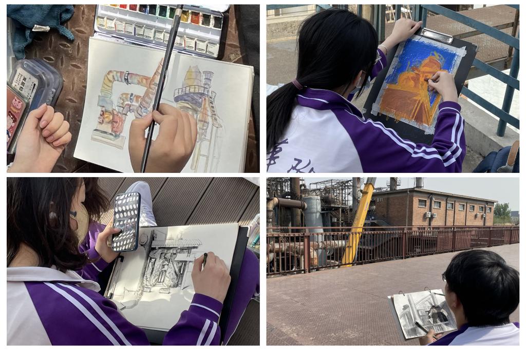 798艺术区位于朝阳区酒仙桥街道大山子地区,又称大山子艺术区,是原国营798厂等电子工业的老厂区所在地。如今的798艺术区已经成为了北京都市文化的新地标,这里的人文景观不同于公园中的池水花草,极大刺激了高二美术班学生的视觉体验,同时激发他们对旧厂区遗迹的历史厚重感产生浓厚的兴趣。学生们选择不同种类的绘画材料作为体现个性的表达,将一幅幅生动有趣的画面逐渐展现出来。