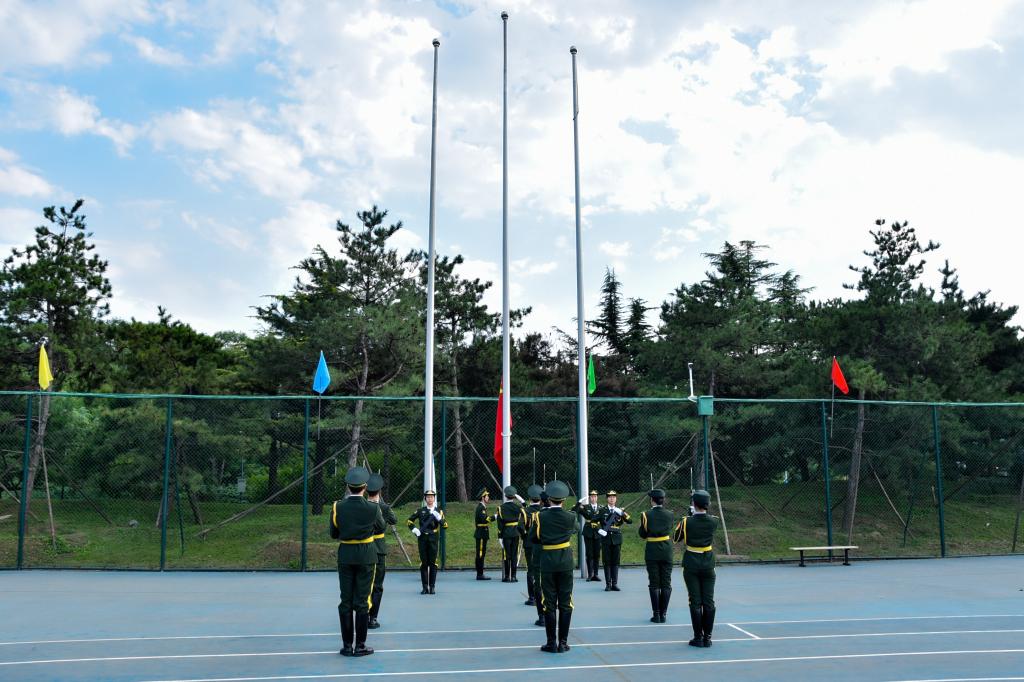 典礼伊始,两校区国旗班迈着整齐的步伐进入操场。五星红旗冉冉升起,全体师生一起唱响国歌。