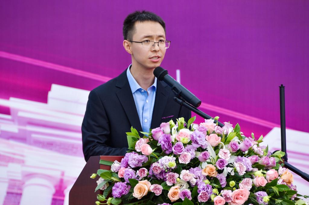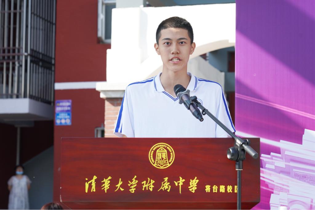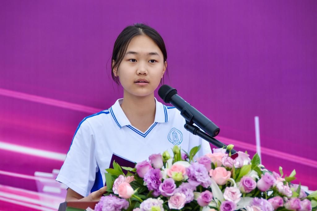将台路校区初三8班王泓岳代表新生发言。他以流利的法语和英语完成开场白后,表达了对这所注重特色教育、特长培养和综合素质提升的独特学府的无限憧憬,立志成长为一名具有爱国情怀、国际抱负、人文感召的中国外交官,努力成为为全面建设社会主义现代化国家做出贡献的杰出人才。