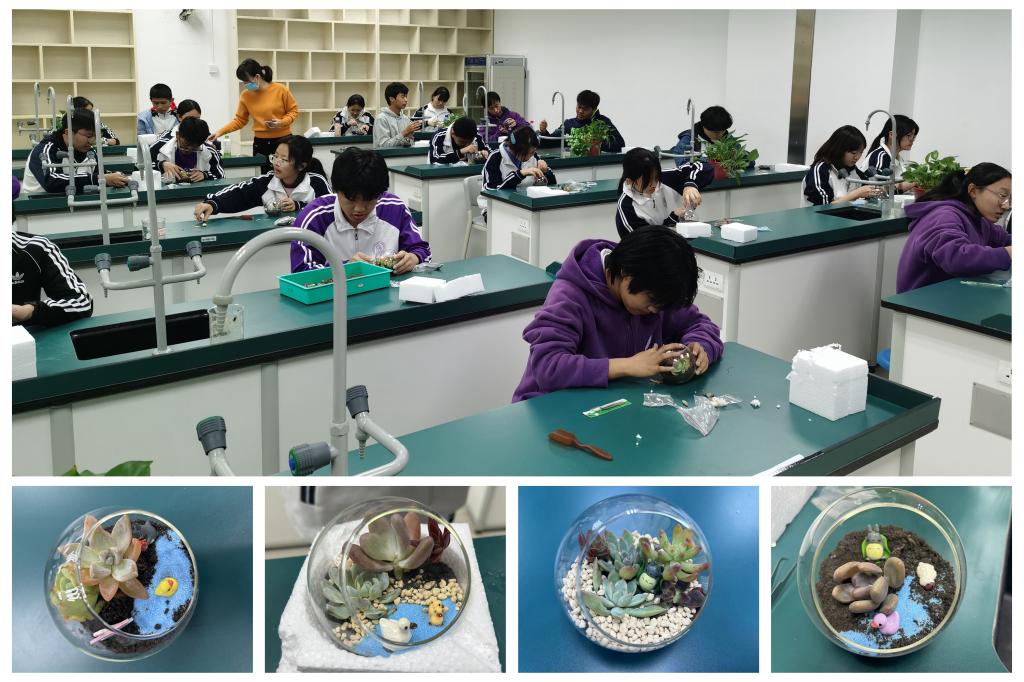 为提高学生对生态系统的进一步认识,以及动手能力和设计能力,为科技节增添生态色彩,学校举办了微景观生态瓶制作的活动。学生利用生物学知识和丰富的想象力、创造力,设计了生态瓶的大体格局,并动手“填土”“选多肉”“种植合适的多肉”,制作出了自己专属的微景观生态瓶。