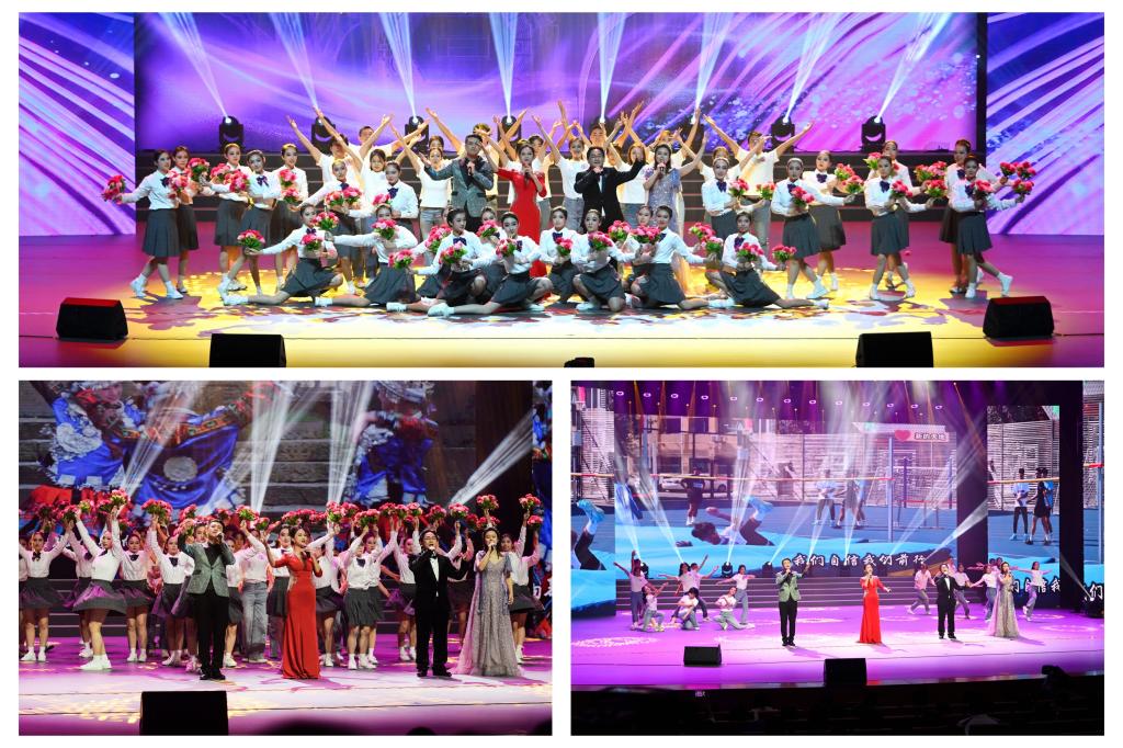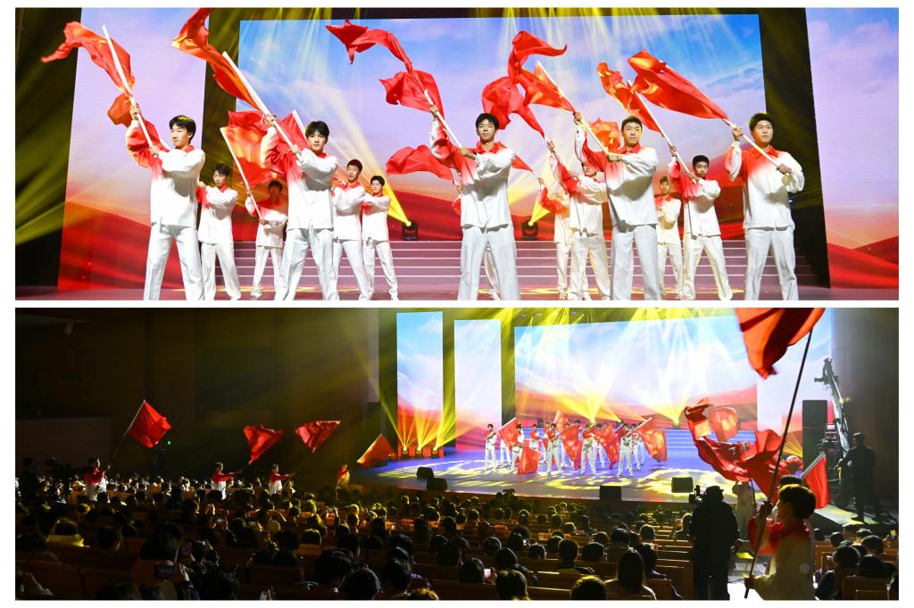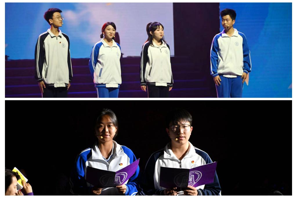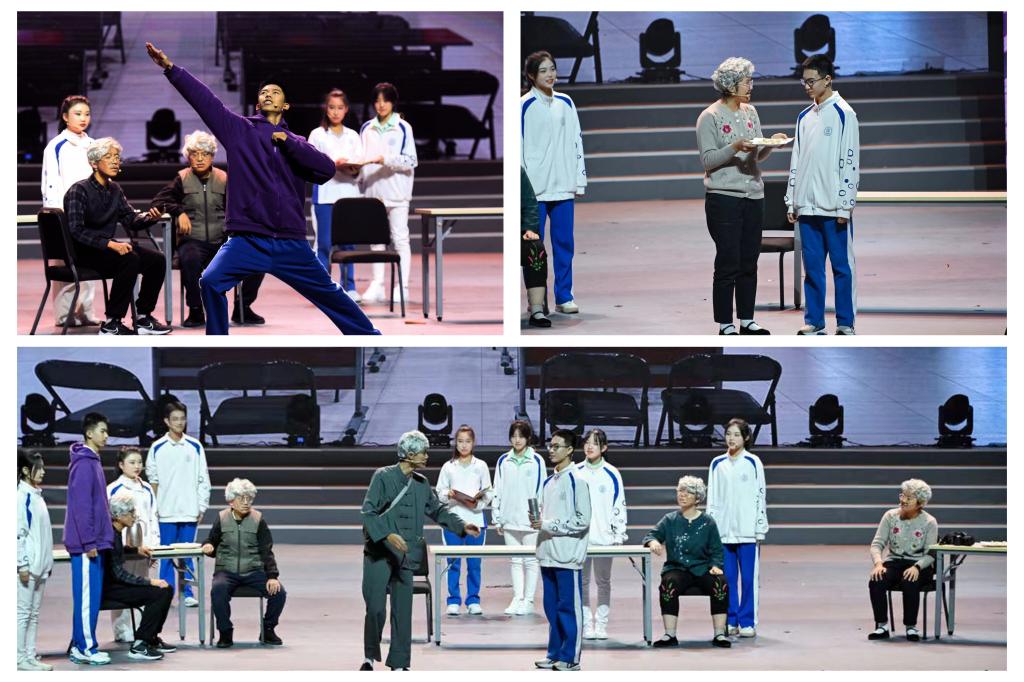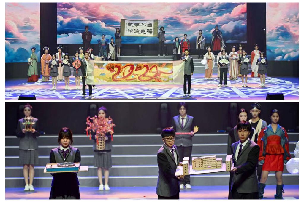 第三篇章 “玉汝于成”。情境短剧惟妙惟肖地呈现学子在劳动中成人成才,欢快的合唱传递豁达开朗的智慧,飘逸的旗舞尽情绽放青春的色彩,奇妙的投影剧让科技与艺术碰撞出新的精彩。