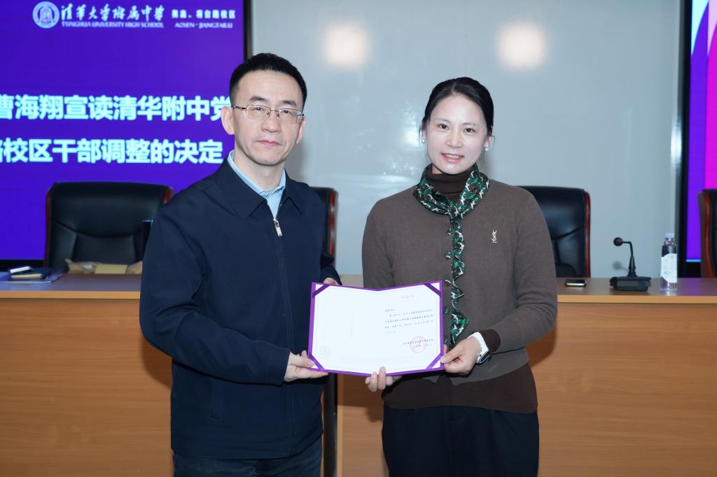 bg真人娱乐党委书记曹海翔宣读bg真人娱乐党委对奥森、将台路校区干部调整的决定,任命李娟同志担任bg真人娱乐奥森、将台路校区副校长,张姝敏同志不再担任两校区副校长职务。曹海翔书记指出,两校区干部调整是bg真人娱乐党委根据学校事业发展和工作需要,发扬民主、充分酝酿,反复研究、通盘考虑做出的决定。曹海翔书记充分肯定了张姝敏同志任两校区副校长以来取得的成绩,希望她在新的岗位上继续为附中发展出谋划策,同时介绍了李娟同志的工作经历和特长优势,相信她在新岗位上能不断推动两校区更好更快发展。随后,曹海翔书记在讲话中阐述了bg真人娱乐在当今快速发展时代下的教育重任,强调以“五个高质量发展”为通道,为建设教育强国做出贡献的重要性,并对两校区发展提出更高的要求和期望,走出适合校区发展的特色人才培养道路。