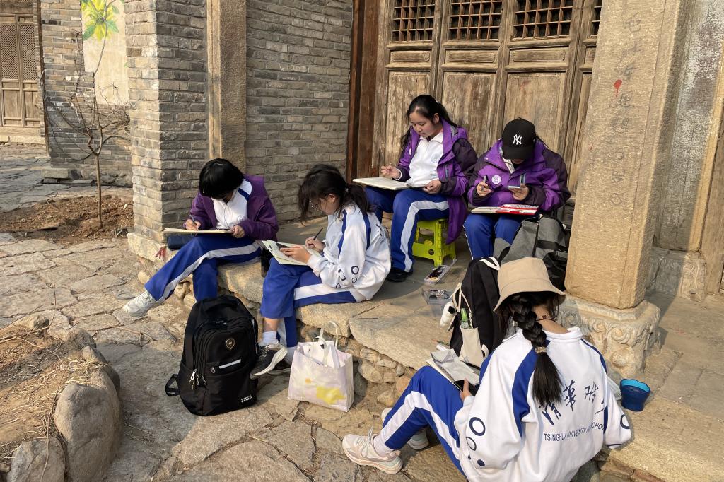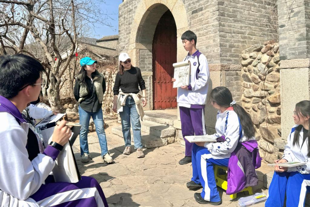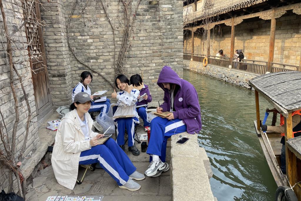 现场写生是美术班学生最为熟悉擅长的采风研学方式。在历史悠久的古北水镇中,鳞次栉比的房屋、青石板的老街、悠长的胡同,无不展现了中国北方明清时期的古镇风貌。学生们被眼前层层叠叠的古建筑吸引,他们用手中的画笔描绘出水镇景色的春意盎然,诠释出了古北水镇的独特文化魅力,让这座水上古城的完美印象在他们的画作中得以永久的保存和传承。