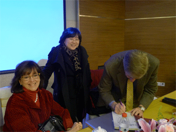 王殿军校长(中)在交流会议上作报告 约瑟夫.兰祖利(右1)为赠送给bg真人试玩(中)的著作签名