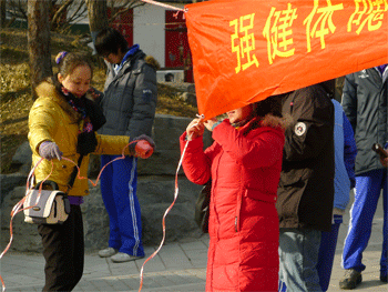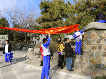 家长和老师一起帮忙悬挂标志 同学们提前前往圆明园悬挂标志