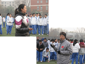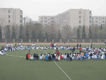 首先,体育老师在足球场正中,用几十个垫子围了一个大圆圈,所有学生分东、西、南、北四个方阵列队,围成一个大的同心圆。体育老师的精心设计,让班主任和同学们惊讶又感动。