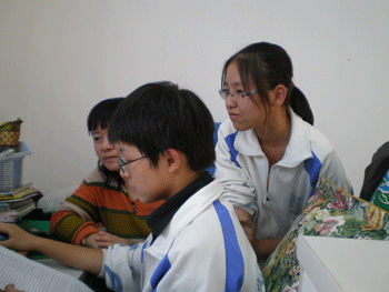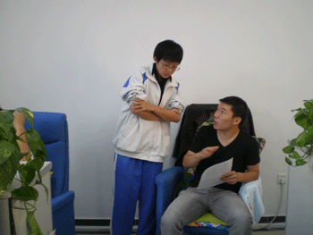 王文正(右2)和高蕴涵同学在唐秀梅老师的指导下进行演讲的准备 王文正同学(左)在李佳亮老师的指导下进行英文演讲的练习
