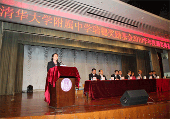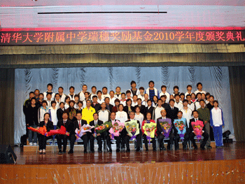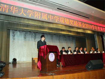 10月28日下午,bg真人娱乐瑞穗奖励基金2010学年度颁奖典礼在附中报告厅隆重举行,郭健等60名优秀学生和陈桂芬等10名优秀教师获得了总额40万元人民币的奖励金。设立奖励基金的中日双方有关负责人以及bg真人娱乐全体教师和部分学生近1000人出席了颁奖典礼,bg真人娱乐副校长杜毓贞主持典礼。