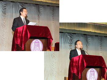bg真人娱乐副校长杜毓贞主持颁奖典礼 王殿军校长(左上)、宫口丈人副董事长分别讲话