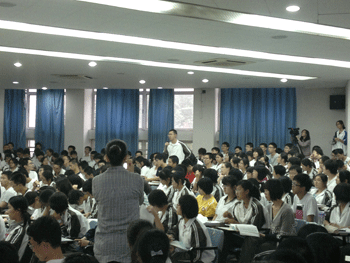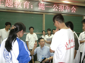 在全场听众的掌声中,曾经是普林斯顿大学分子生物学系建系以来最年轻的终身教授和讲席教授、头顶各种学术光环的施教授隆重出场,在莘莘学子面前,施教授显得特别平易近人,他首先通过大量图片向学生们展示了颇具震撼力的科学之美。随后,施教授从自己的成长经历、求学经历、工作经历谈起,和学生畅谈如何坚持理想、坚守道德准则,如何应对压力和挫折……他强烈的爱国主义情怀、对社会和弱势群体的责任感以及对人生真谛和科学真理孜孜不倦的追求感染了在场的每一位师生。施教授还就目前中学生出国问题给附中学生提出了中肯的建议,既鼓舞了斗志也明确了方向,使学生受益匪浅。在自由提问环节,面对一系列尖锐的问题,施教授再次表现出他的真诚和睿智,赢得学生们热烈的掌声和由衷钦佩。
