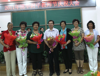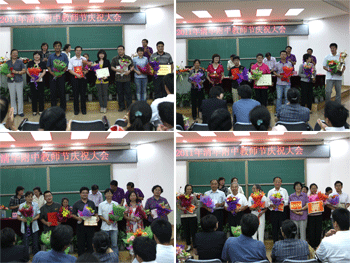 附中党委副书记周兆玉宣读了2010~2011学年度教师个人和集体表彰名单。与会领导为获得各级荣誉和奖励的教师代表进行了颁奖;学生们也送上鲜花表达敬意。