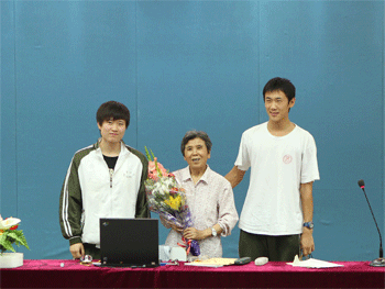 讲座后马班学生代表为颜家珍老师(中)献花 颜家珍老师在圆明园遗址做现场讲解