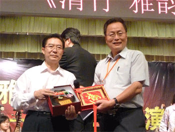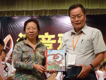 bg真人娱乐校长王殿军(左)与三民国中校长张文忠同唱《绿岛小夜曲》 bg真人娱乐校长王殿军(左)与三民国中校长张文忠互赠礼物