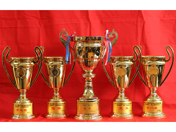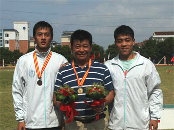 高0809班洪晖(左)、李涛(右)与马 汝平教练合影 bg真人试玩学生在2011中田赛中获得的奖杯