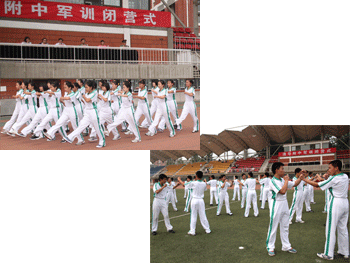 各班方队接收检阅 女生队列表演(左上) 男生拳术表演(右下)