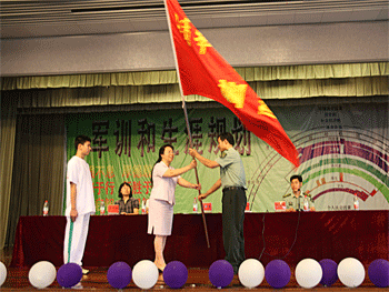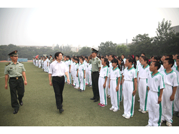 初11级军训开营式上授旗 王殿军校长(右)检阅军训队伍