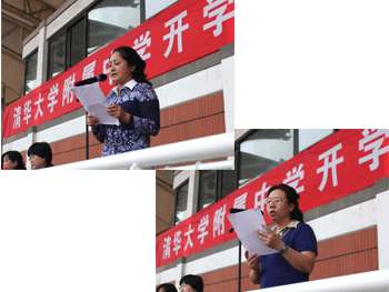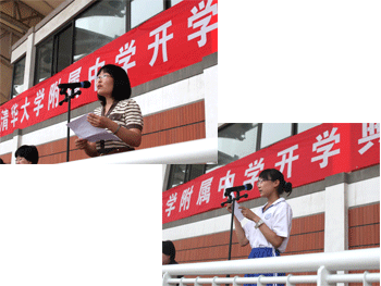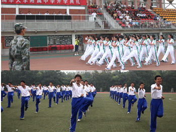 教师(左上)和学生代表分别发言 新初一女生队列表演(上)和新高一男生拳术表演