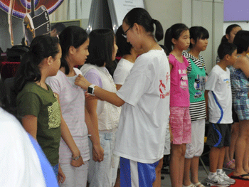 欢迎会开始,乐团办公室主任胡军老师请所有新生站到专门为他们准备的红地毯上,并由“学生小导师”为他们佩戴乐团的胸牌,胡军老师宣布他们正式成为乐团的团员。