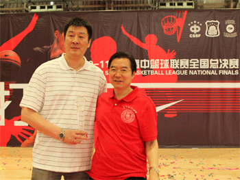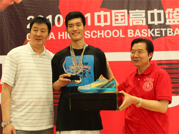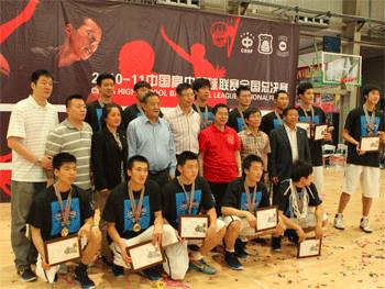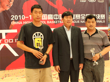 赛后,附中男篮队员与领导合影 王殿军校长(右)为张涛颁发最佳教练员奖