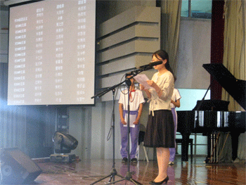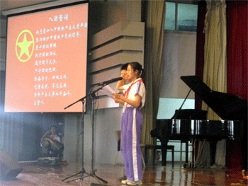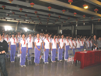 在颁奖之后,两个年级新入团的团员面对团旗集体宣誓。在《少年先锋队队歌》和《中国共产主义青年团团歌》的旋律声中,表彰大会圆满结束。