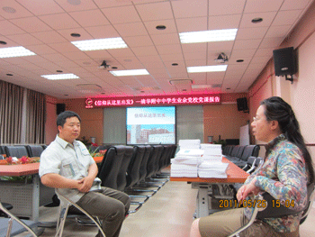 报告会前杜毓贞副校长(右)与王广辉书记交流 报告会现场