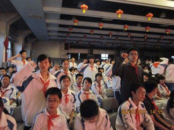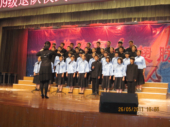 接着,初二9班一曲悠扬的《百年风雨》拉开了“红歌唱响校园”演唱会的序幕,随后,各班先后演唱了或感情深沉或轻快活泼的红色歌曲。2班演唱的《保卫黄河》雄壮激扬、4班的《红星闪闪》掷地有声、8班的《唱支山歌给党听》感情充沛、10班女声激越、男声洪亮的《映山红》、11班的《我的中国心》真挚深沉;6班的《在灿烂的红星下》和12班的《游击队歌》整齐嘹亮;1班的手语版《国家》整齐优美;7班的《五月的鲜花》威严大气;2班的《青春舞曲》和3班的《长江之歌》轻快活泼。
