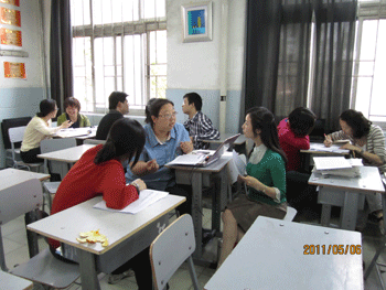 王殿军校长(左1)参加高二研讨 周兆玉副书记(右1)参加初一研讨