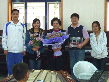 附中民乐团师生为翠微路小学民乐团史艺(左2)、任凤萍老师(中)献花-左图