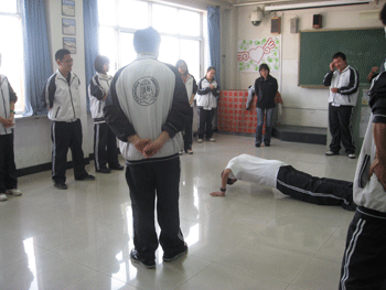 活动开始后,每一轮活动中,同学们需要按陈老师的口令来完成相应的动作,尽量不要出现错误。如果组员犯错则组长需要做一定数量的俯卧撑作为惩罚,惩罚的个数视轮数及犯错次数而定。同学们都小心翼翼,尽量不出错误,但也难免出现个别小错误。当组长在“接受惩罚”的时候,组员都为他加油鼓掌。五轮比赛结束后,每位组长都做了超过160个俯卧撑。但是三名组长毫无怨言,都表示愿意承担自己的责任,也有不少组员主动陪伴组长共同受罚,场面温馨而欢快。