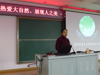 国际热爱大自然促进会总会副会长、秘书长谈慈魁向大家介绍了国际热爱大自然促进会这个民间组织。五位来自印度尼西亚的志愿者向同学们展示了大自然快乐操,同学们一边收听讲座一边参与互动,体会国际热爱大自然协会的“维护生命、热爱生命、光辉生命”的理念。