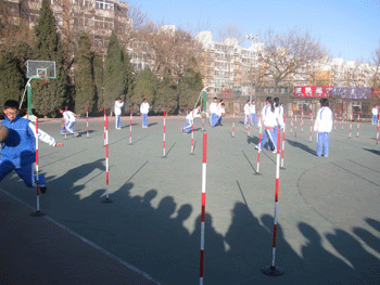 特别邀请体育组老师制订比赛规则:撞到杆一定要扶起来,若球运丢了,捡回后必须要回到丢球位置,有犯规行为扣除相应分数;明确班级的每一位同学都要上场,接力传球。比赛过程中大家表现非常出色,女生运球平稳,速度较快,初有技巧;男生运球飞速,勇敢无畏,奋勇争先。