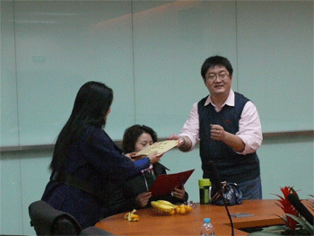 王殿军校长(左2)讲话 胡军老师(右)为外请专家发聘书